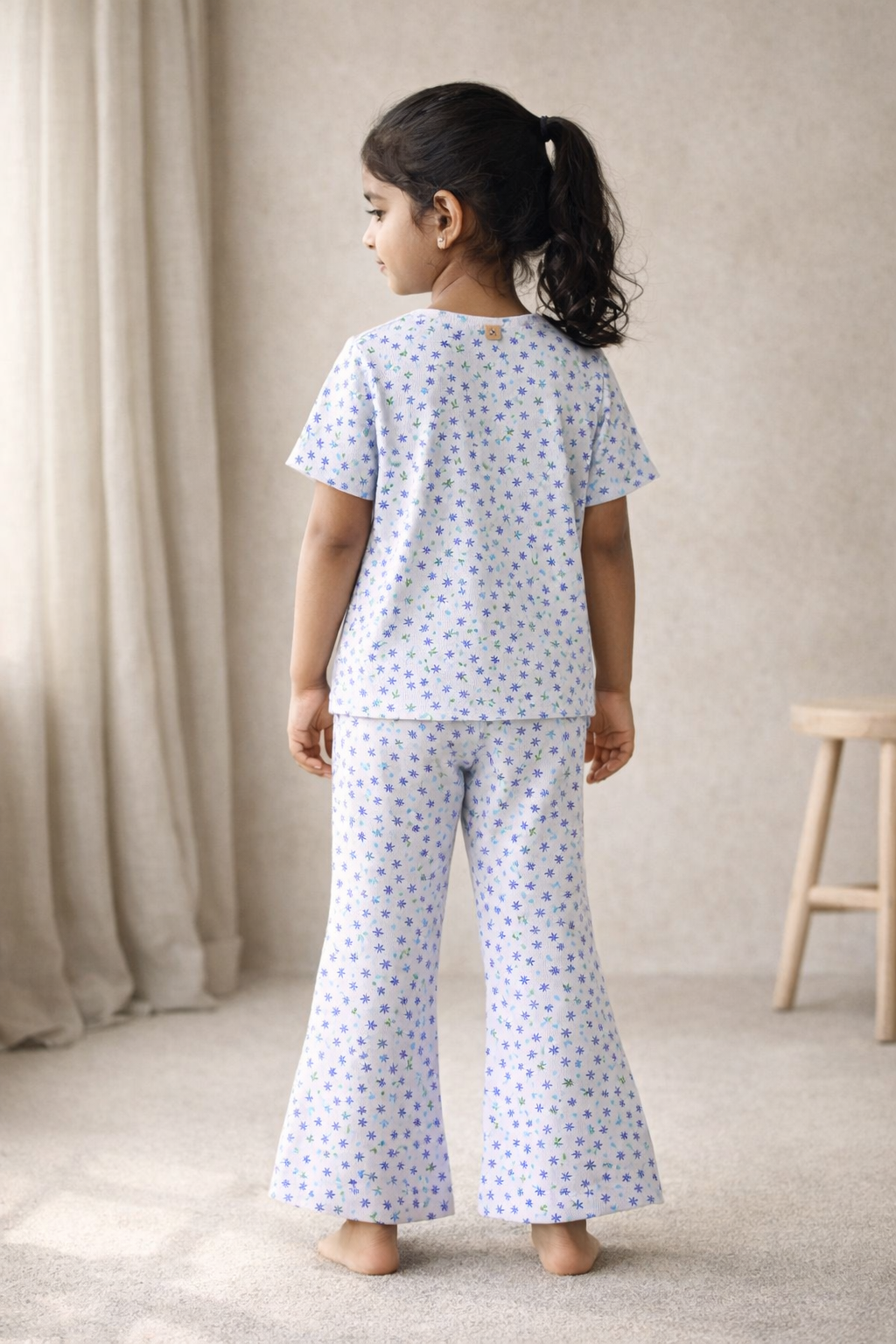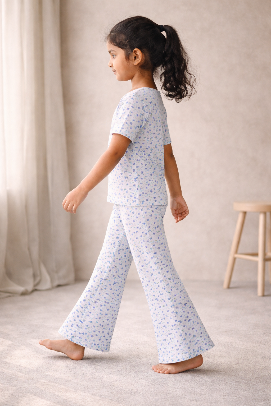 The subtle pink base is enhanced with delicate all-over floral prints, giving it a clean, modern, and premium look. The short-sleeve top pairs perfectly with stylish flared pants, making it an ideal outfit for both relaxed days and outings.
