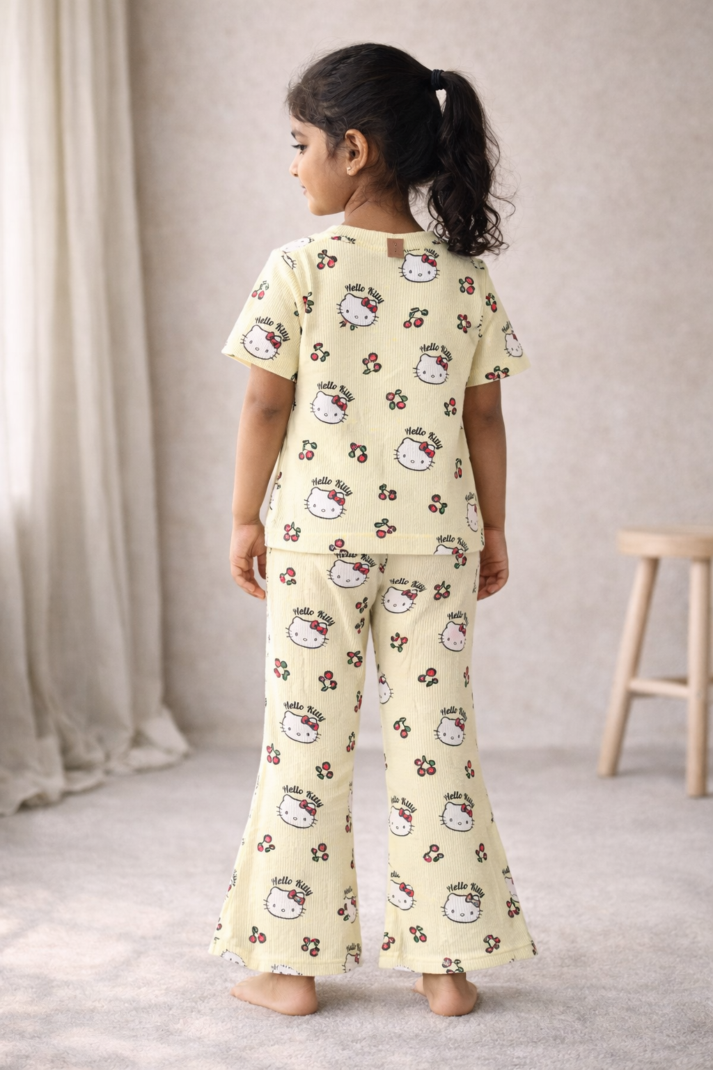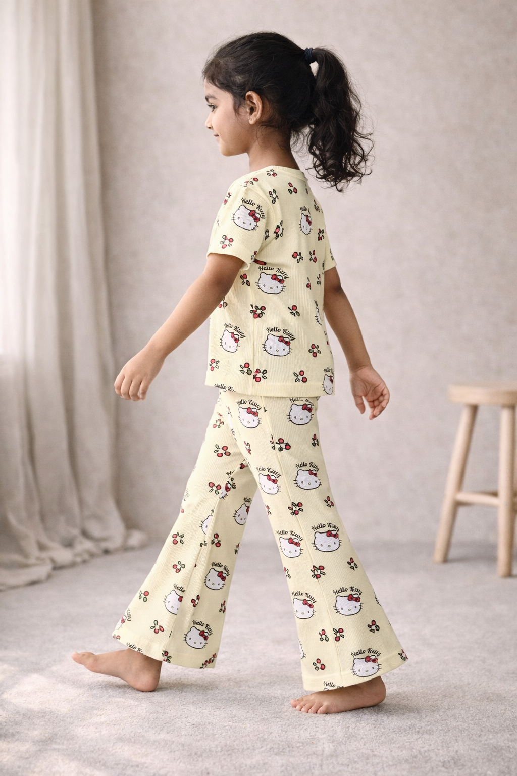 The subtle pink base is enhanced with delicate all-over floral prints, giving it a clean, modern, and premium look. The short-sleeve top pairs perfectly with stylish flared pants, making it an ideal outfit for both relaxed days and outings.