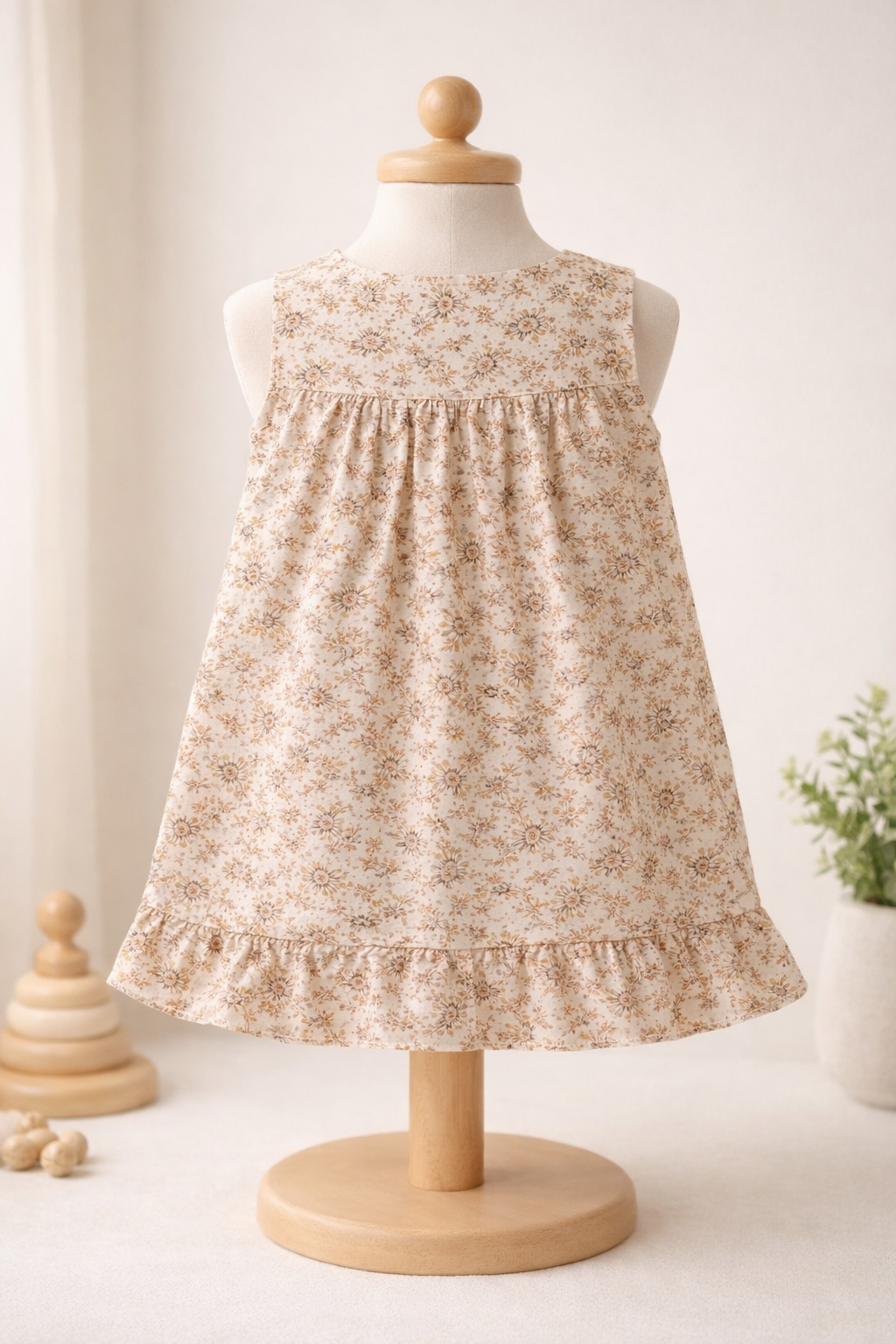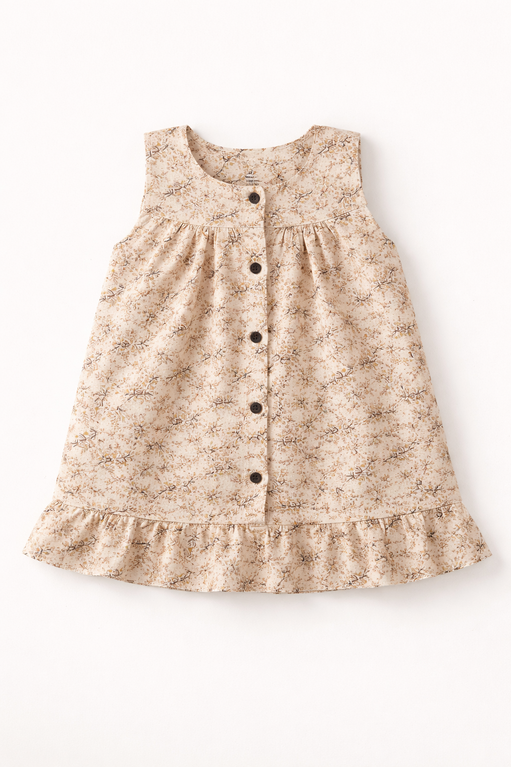 Baby Girls Muslin Cotton Sleeveless Frock – Soft floral beige Print, Button Front, Ruffled Hem (0–24 Months)
