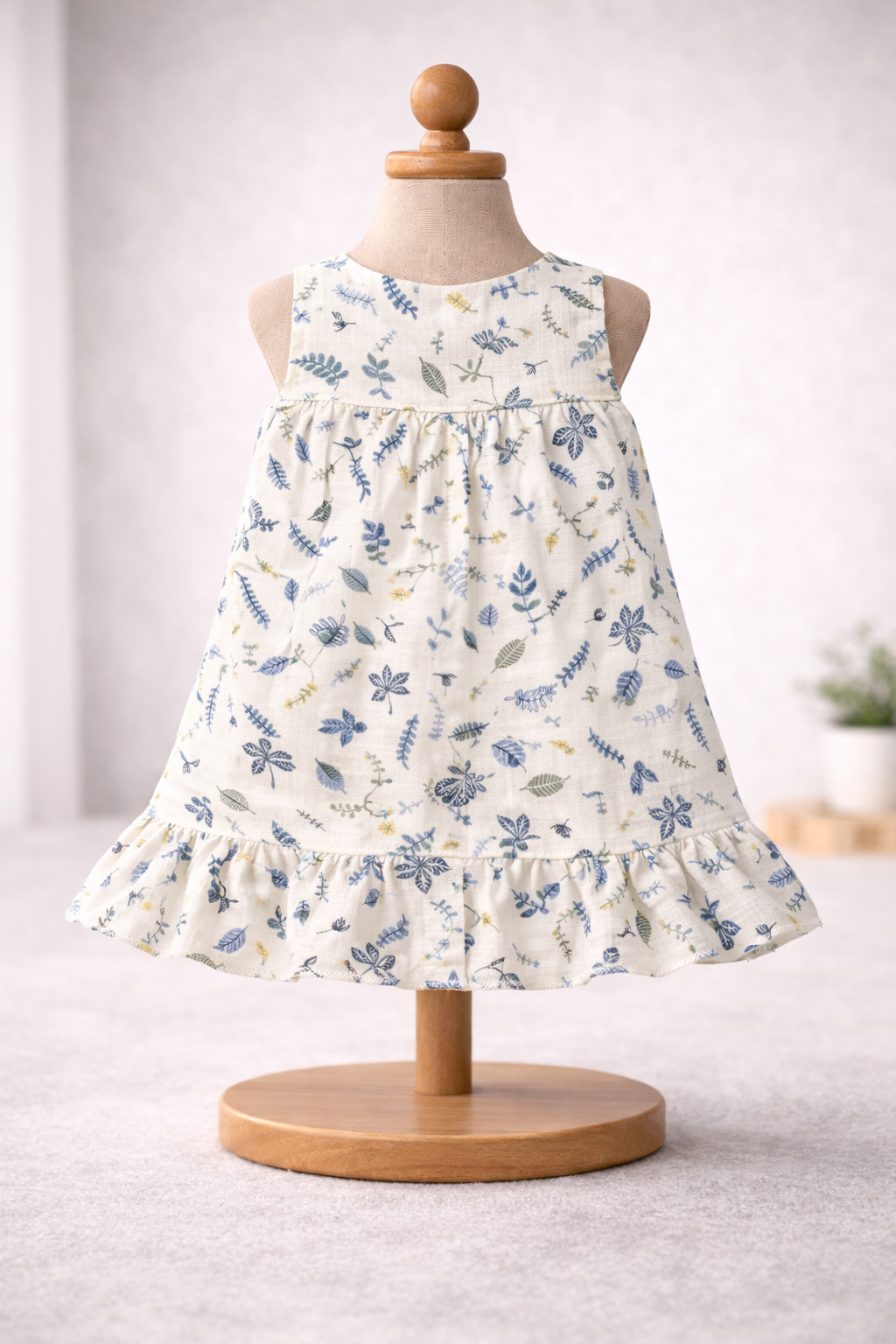 The frock features a soothing cream-beige base with delicate nature-inspired prints, adding a subtle, elegant charm. A front button placket allows easy dressing and quick changes, while the gathered chest and soft ruffled hem create a relaxed fit that lets your baby move freely and comfortably.