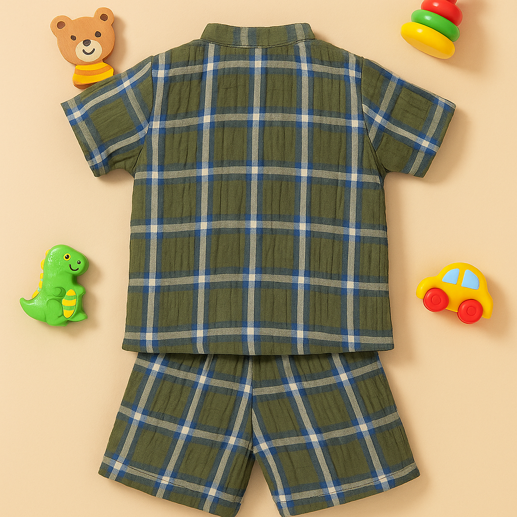 Dress your little one in comfort and style with our 100% Organic Muslin Cotton COORD SET WITH DOUBLE LAYERED SHIRTS AND SHORTS.