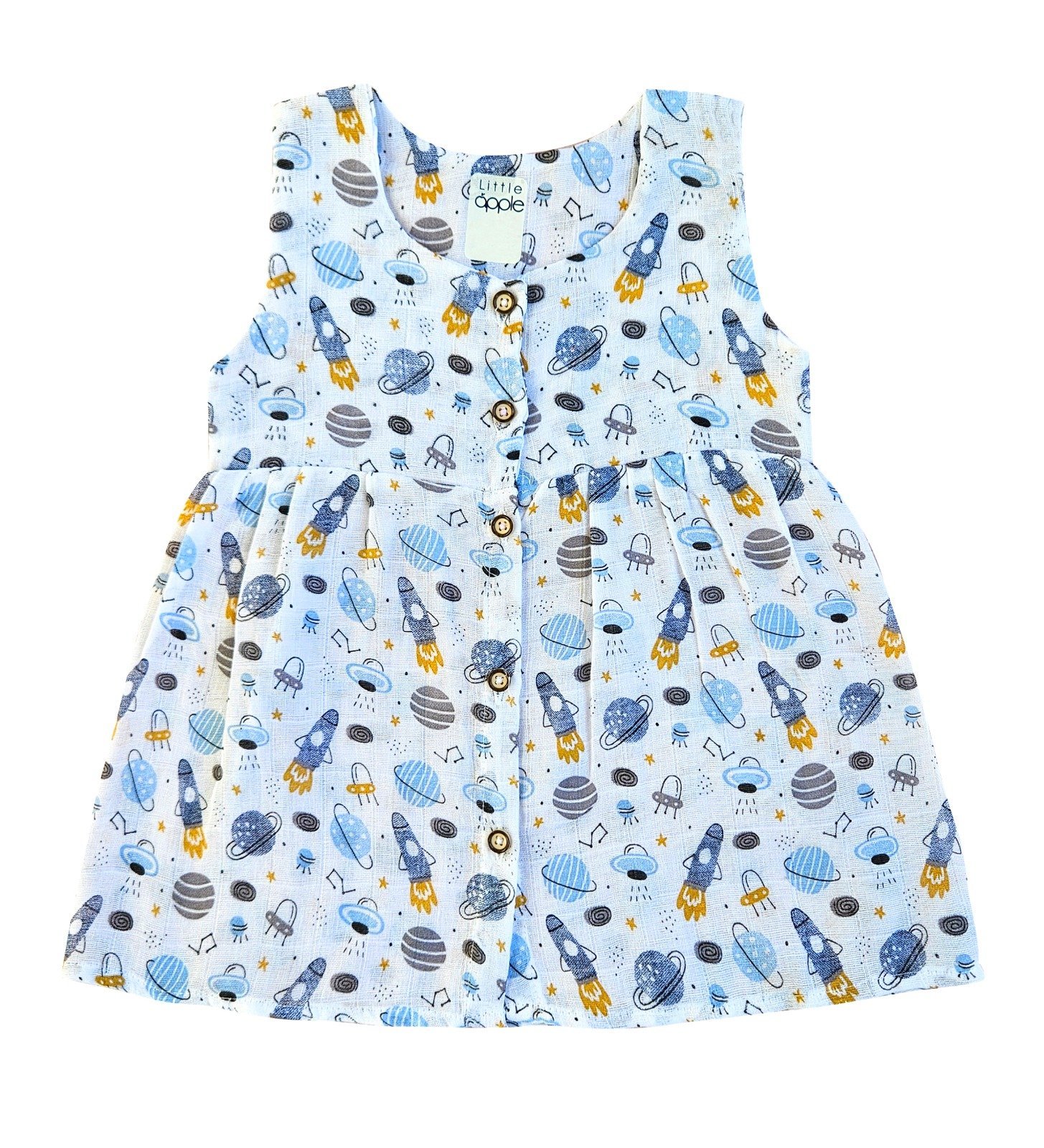 Dress your little one in comfort and style with this sleeveless muslin frock. Crafted from 100% organic muslin cotton, the frock features a double-layered bodice for extra softness and durability, while the flowy bottom keeps it light, airy, and breathable. Perfect for everyday wear, playtime, or special occasions.