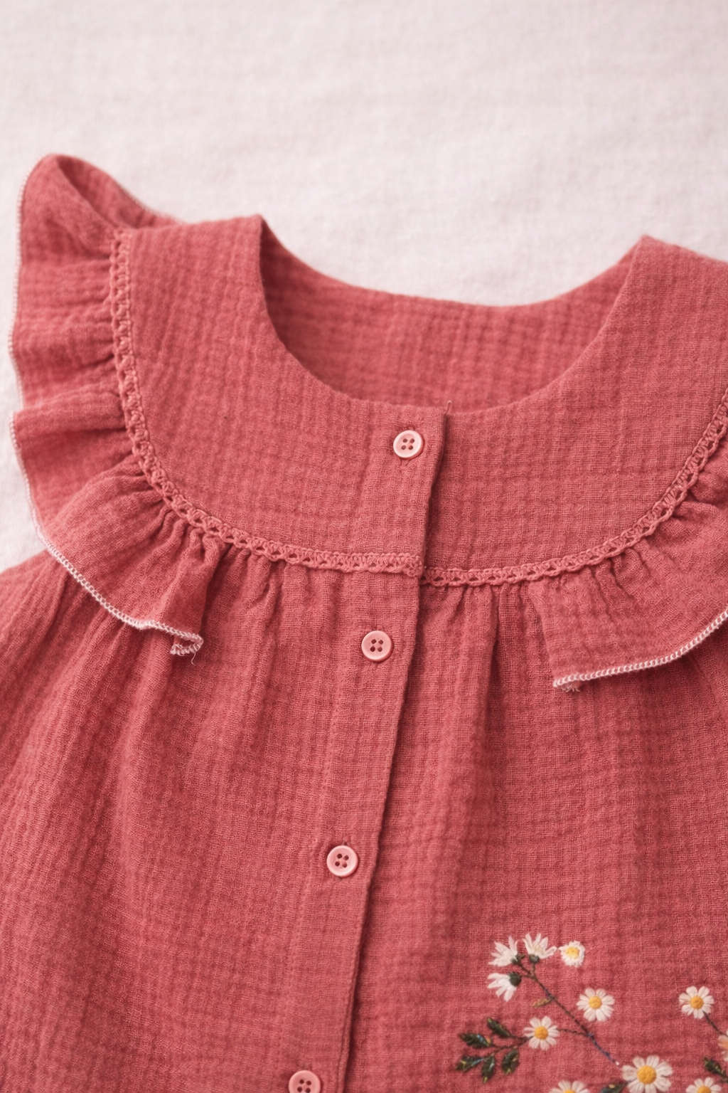 The beautiful coral red shade combined with delicate daisy floral embroidery adds a fresh summer feel, making it perfect for casual outings, playdates, birthdays, and festive occasions. The front button closure ensures easy dressing, while the gathered flare silhouette provides freedom of movement for active babies.