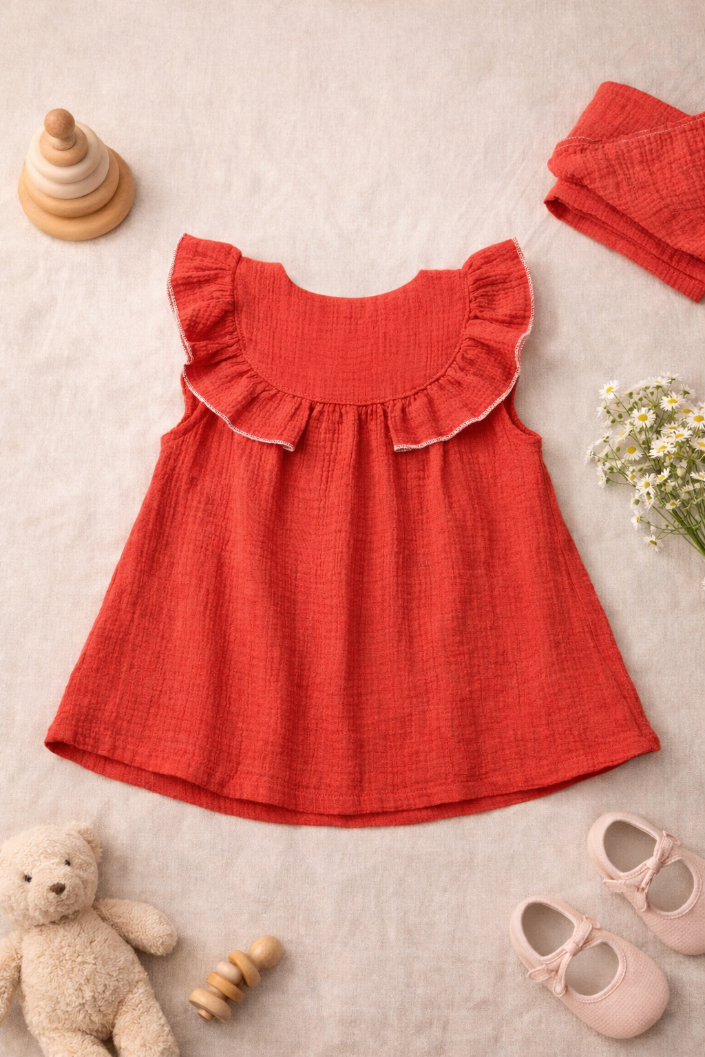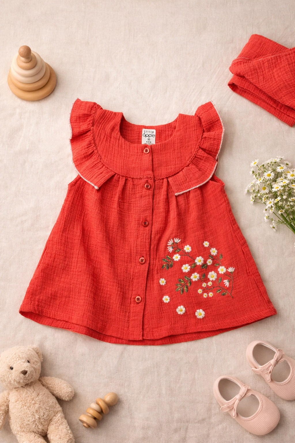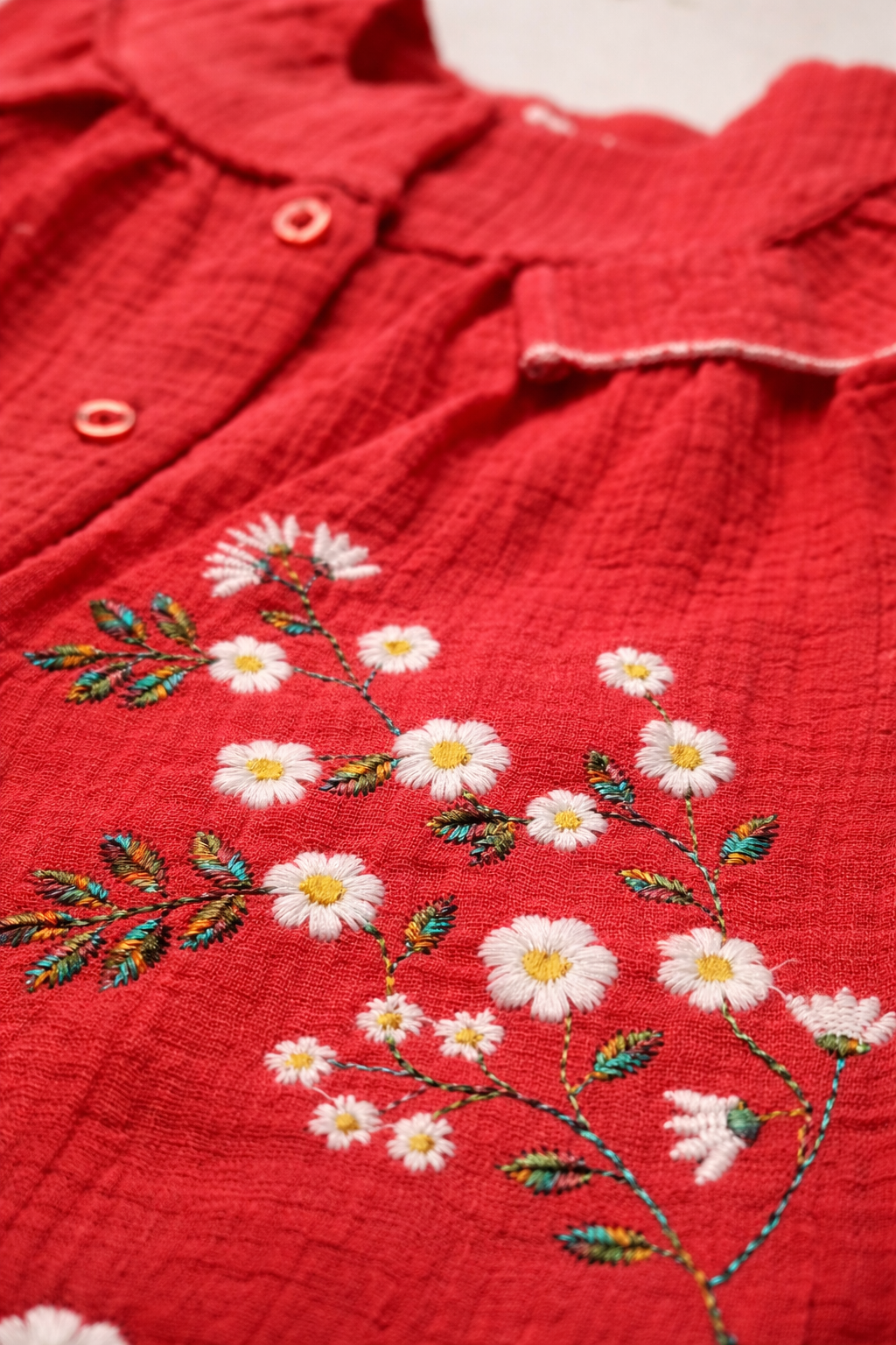 The beautiful coral red shade combined with delicate daisy floral embroidery adds a fresh summer feel, making it perfect for casual outings, playdates, birthdays, and festive occasions. The front button closure ensures easy dressing, while the gathered flare silhouette provides freedom of movement for active babies.