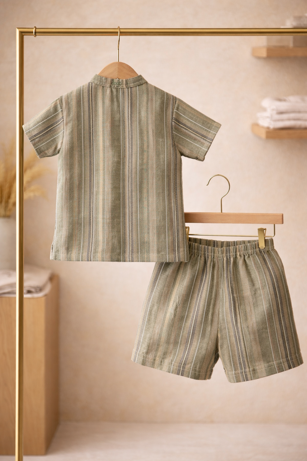 The structured Chinese collar, clean button placket, and relaxed silhouette create a timeless summer look, while the soft elastic waistband ensures easy movement for crawling, walking, and playful moments.