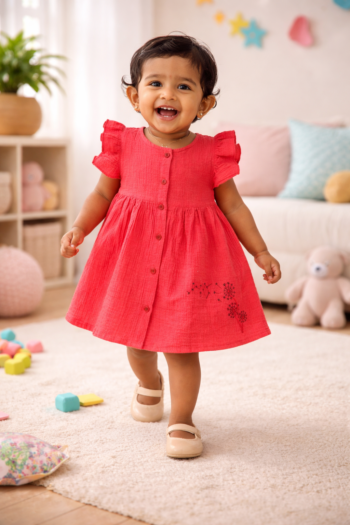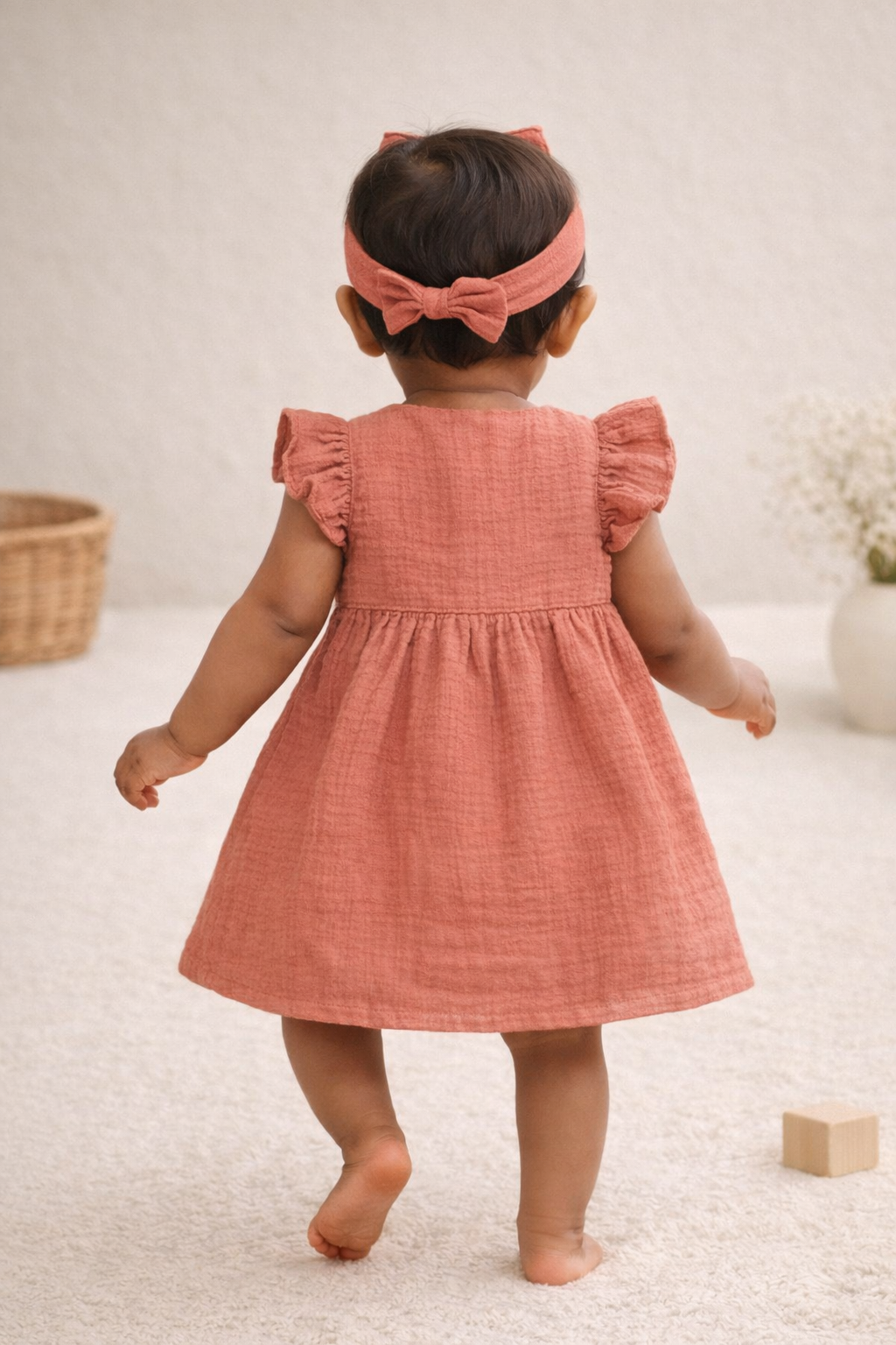 Dress your little one in breathable luxury with this coral pink muslin cotton baby frock set, designed for all-day comfort and effortless style. Crafted from soft double-layer crinkle muslin fabric, this outfit keeps your baby cool, light, and irritation-free — perfect for Indian summers.