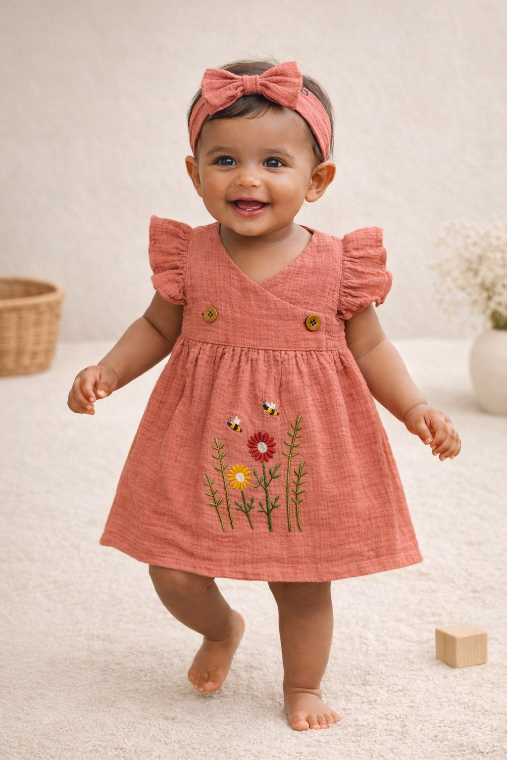 Perfect for summer days, playtime, or gifting, this baby muslin cotton frock for girls offers all-day comfort with a soft, natural look.
