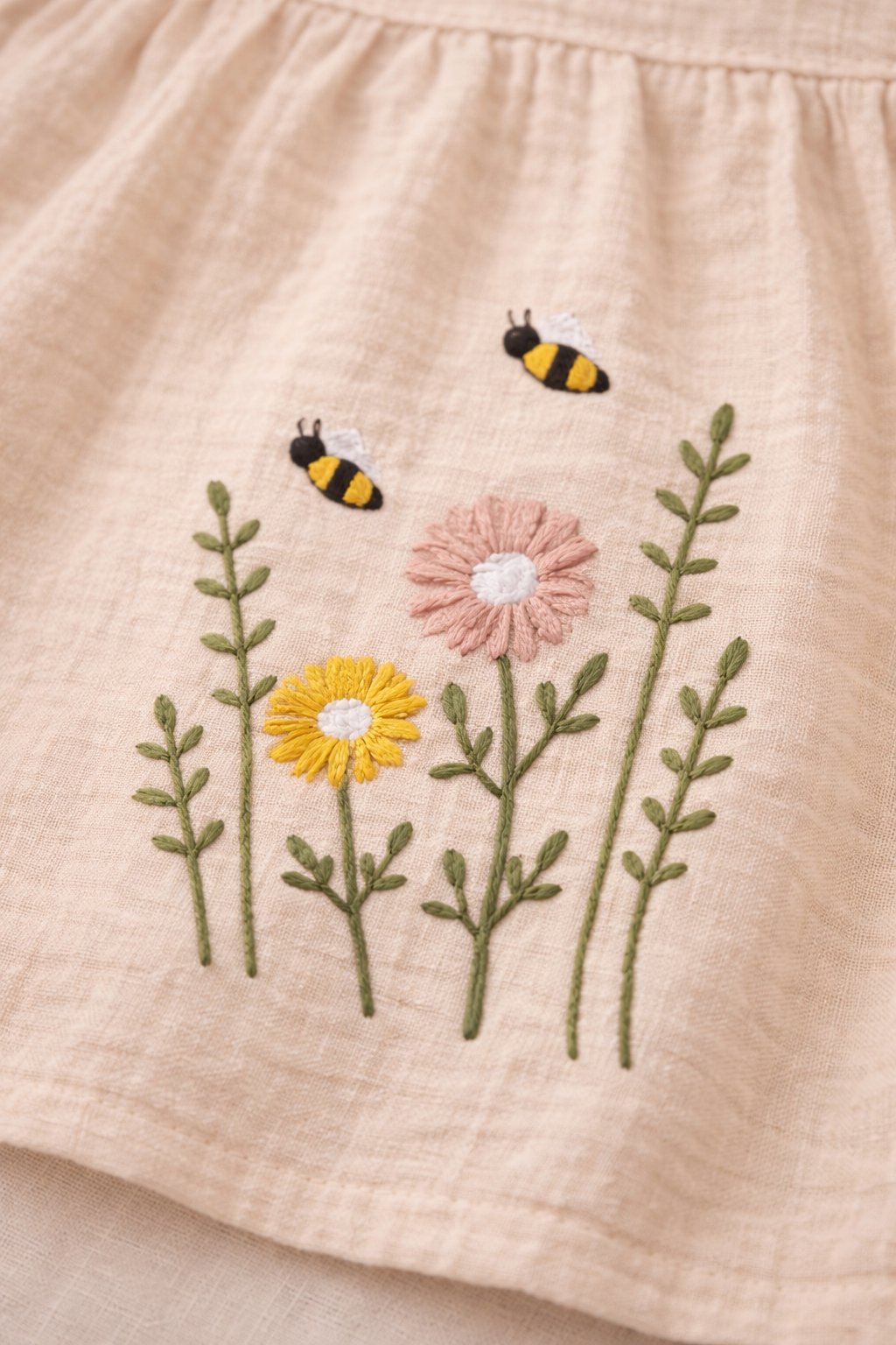 Details: Soft gathers and ruffled hem