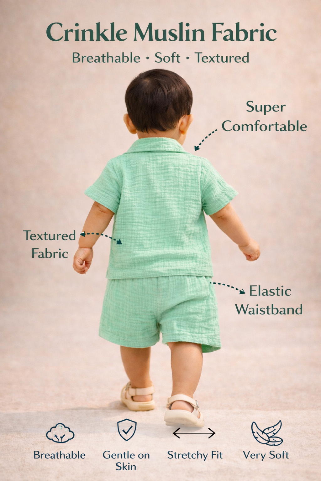 Premium Muslin Cotton Baby Boy Coord Set – Soft Crinkle Shirt & Elastic Shorts | Summer Breathable Outfit